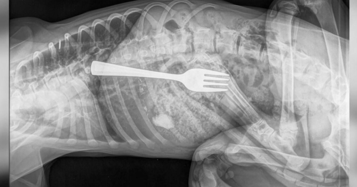 "Never a dull moment in the ER.... we often get surprised too! Imagine getting the call: 'I think my dog ate a fork!'," they captioned the video.
