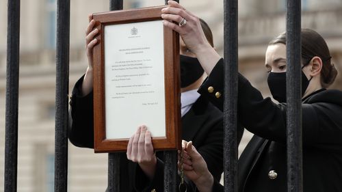 Soon after the announcement of Philip's death, people lined up outside Buckingham Palace to see the official notice that had been attached to the gate. It was removed soon afterward because of concerns that it would attract crowds, violating social distancing rules during the COVID-19 pandemic.