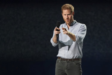 Prince Harry, Duke of Sussex, speaks at “Vax Live: The Concert to Reunite the World” in Los Angeles.Credit: