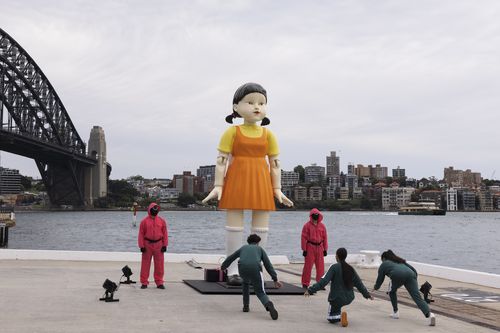 Streaming platform Netflix has installed a 4.5 metre version of the "red light, green light" doll at The Rocks as part of Halloween celebrations.