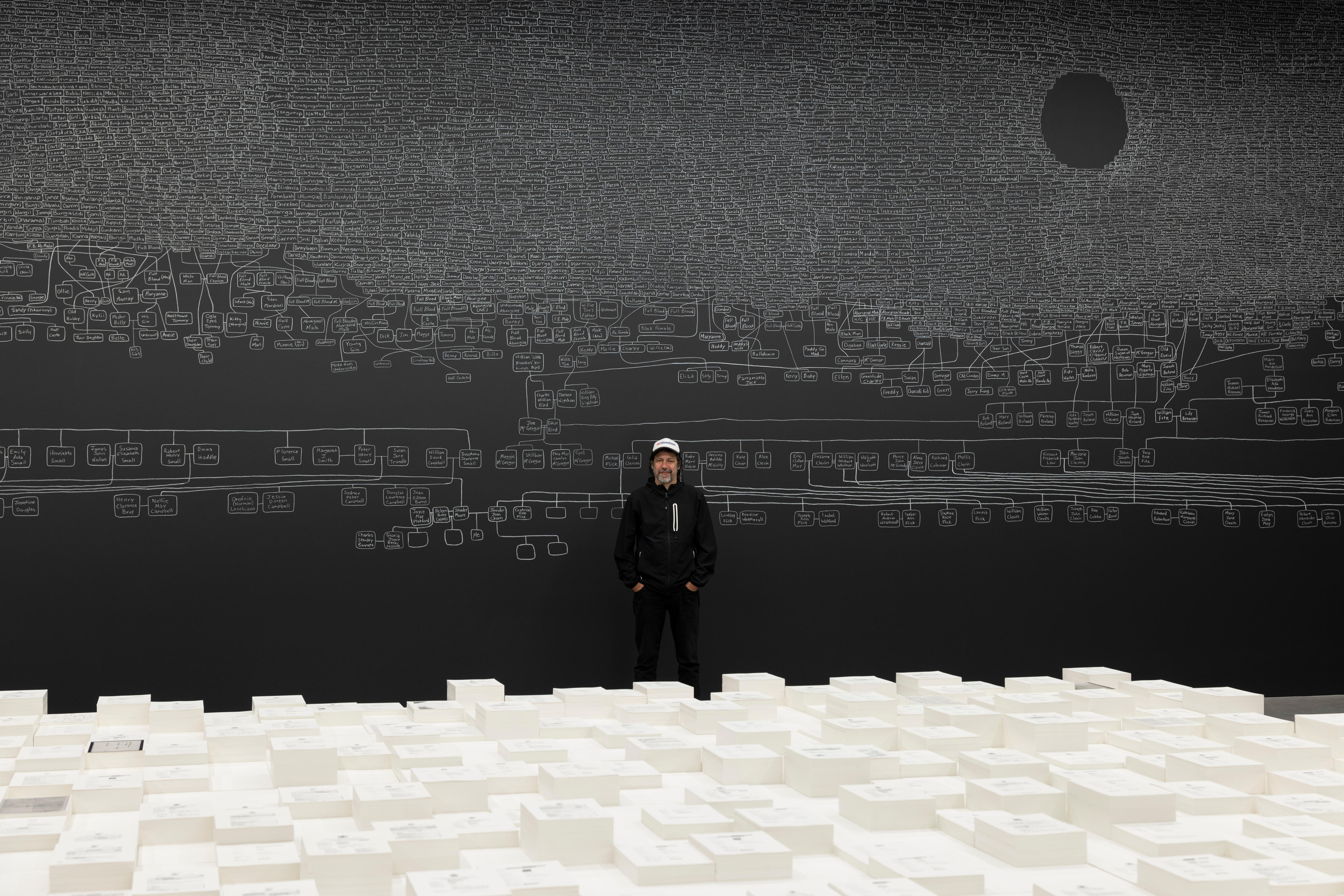 Over the past two months, Moore has transformed the archetypal white cube of the Australia pavilion into a giant, sprawling family tree, using blackboard paint and chalk.