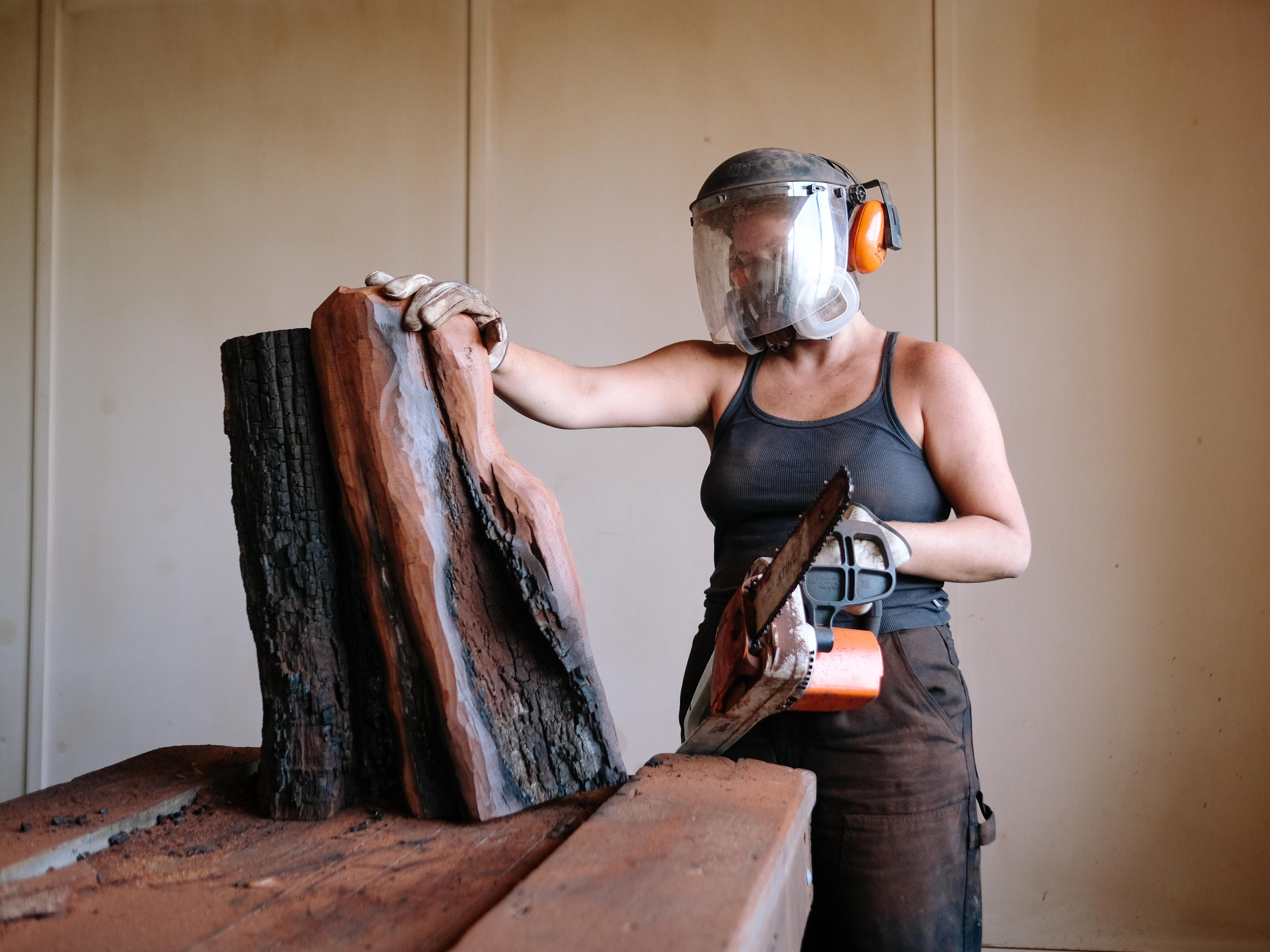 Carving the wood, she's constantly moving her body and switching angles, using an array of tools — from chainsaws, to wood carving bits on angle grinders, gouges and chisels.